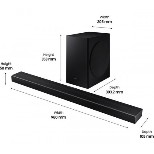 מידות הסאונד בר: רוחב: 98 ס"מ. גובה: 5.8 ס"מ. עומק: 10.5 ס"מ.