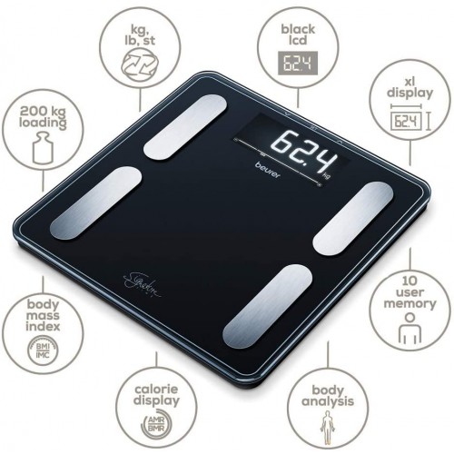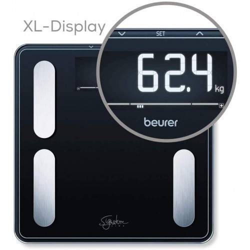 תצוגת משקל, שומן גוף, תכולת מים בגוף, אחוז שרירים, מסת עצם עם חישוב BMI