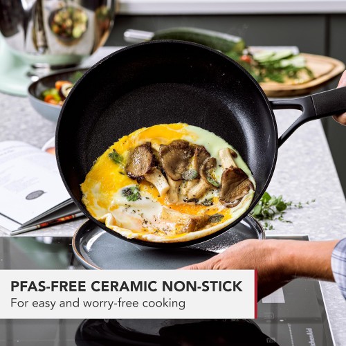 ציפוי קרמי, ללא PFAS, נון-סטיק המספק שחרור מזון קל וניקוי מהיר. עם הקווים הנקיים