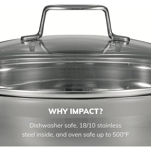 בהסתמך על הניסיון רב השנים של Scanpan בייצור כלי בישול ברמה עולמית, המעצבים הדנים יצרו את מגוון כלי הבישול Impact. כולל את כל המאפיינים המצופה מ-Scanpan חומרים באיכות גבוהה, עיצוב אטרקטיבי ופונקציונלי וביצועים מעולים - כלי בישול Impact עשויים מפלדת אל חלד 18/10 עם בסיס סנדוויץ' בעובי 6.4 מ"מ בעל ליבת אלומיניום לפיזור חום אחיד