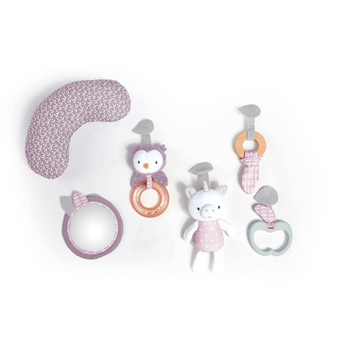 כולל 6 צעצועים תלויים הניתנים להסרה, חד קרן מקטיפה, רעשן חרוזים, מראה, נשכן תפוח עשוי מגומי טבעי, צעצוע טבעת מעץ וכרית לזמן בטן