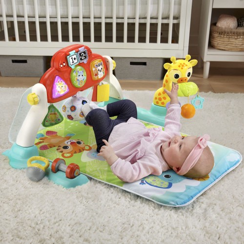 מחצלת המשחק הרכה והצבעונית סובב ולחץ על כדור המשקולת, שקשק את רעשן המשקולת וחקור