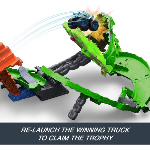 משאיות המפלצת של Hot Wheels, כרישים נגד דינוזאורים, מתחרות כדי להביס דרקון סייבורג בערכת