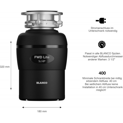 טוחן האשפה BLANCO FWD Lite הוא פתרון יעיל, שקט וחסכוני לטיפול בשאריות מזון ישירות מהכיור. המכשיר מאפשר טחינה מהירה של שאריות מזון, חוסך שימוש בשקיות אשפה ומונע ריחות לא נעימים. הטכנולוגיה המתקדמת מבטיחה פעולה חלקה ונקייה, עם התקנה פשוטה שמתאימה לרוב הכיורים, וניתן לשלב בקלות עם מדיחי כלים הודות לחיבור L-Pipe.